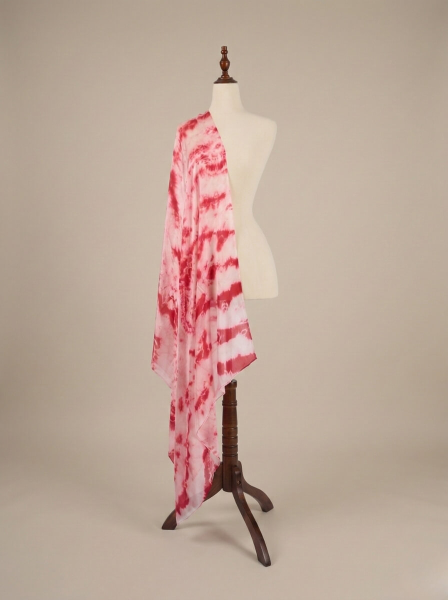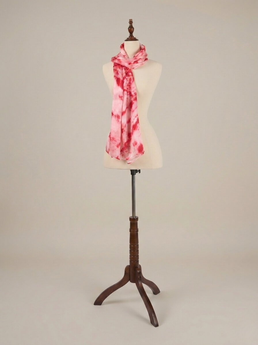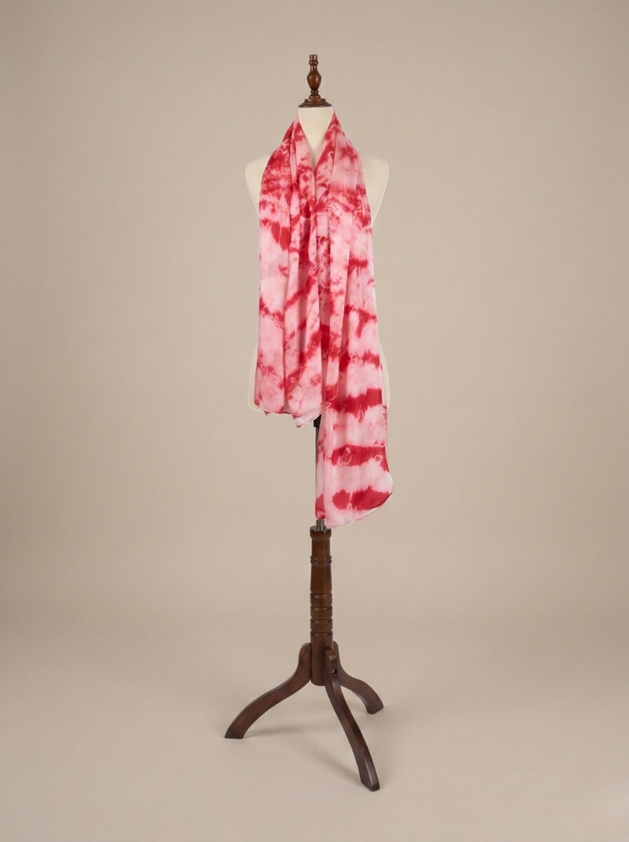 Làm ra một chiếc khăn lụa nhuộm loang không hề đơn giản. Vì vậy, tôi phải tính toán kỹ lưỡng từng nút thắt và từng nhịp nhúng màu. Ban đầu, tấm lụa mộc chỉ mang một sắc trắng tinh khôi. Sau đó, qua đôi bàn tay tẩn mẩn, những vệt màu đỏ hồng dần hiện lên. Hơn thế nữa, màu sắc loang tự nhiên này rực rỡ tựa như những cánh hoa đào chìm đắm trong sương sớm. Chắc chắn, bạn sẽ không bao giờ tìm thấy hai chiếc khăn hoàn toàn giống hệt nhau.
